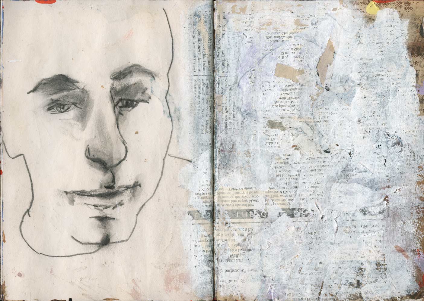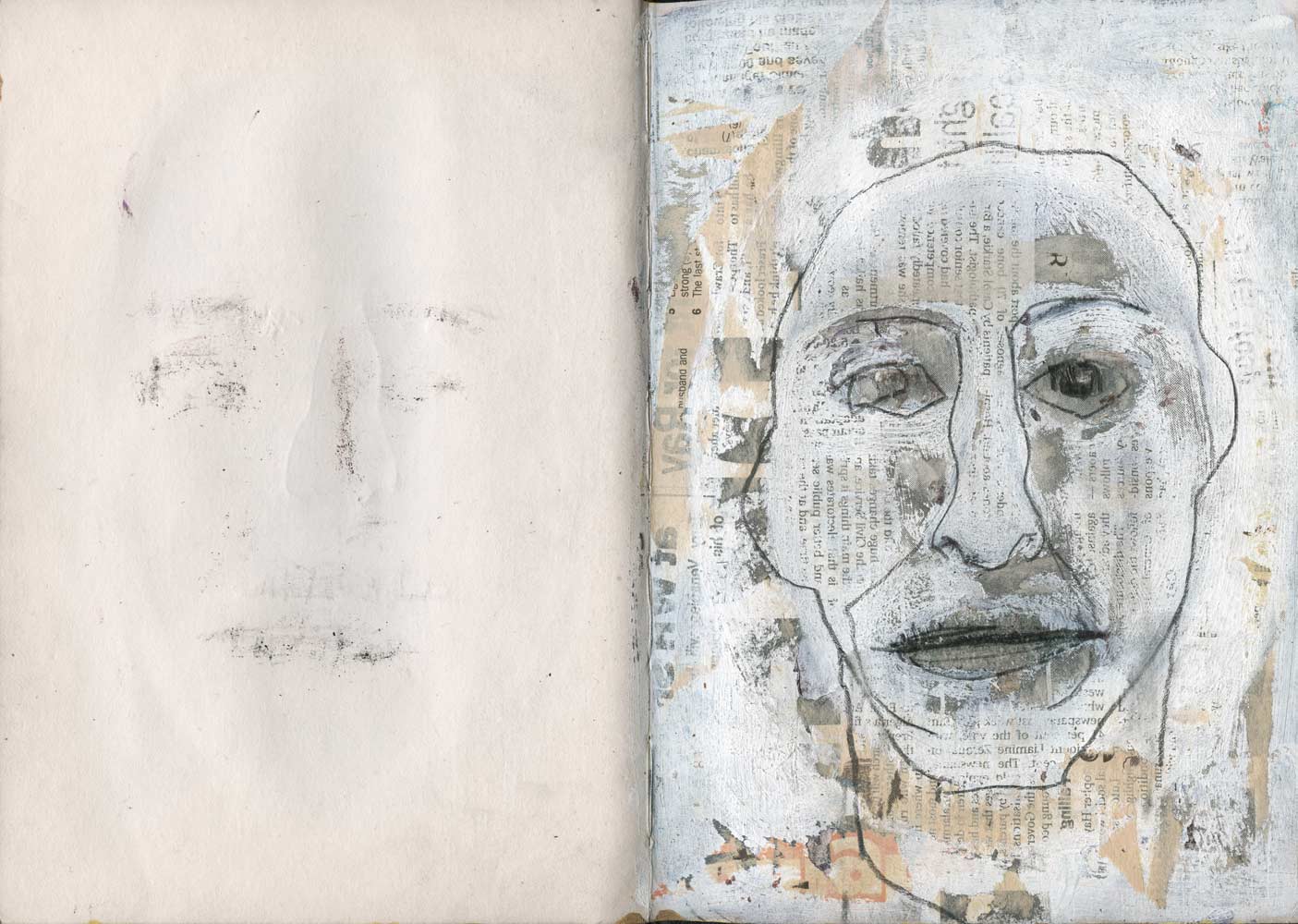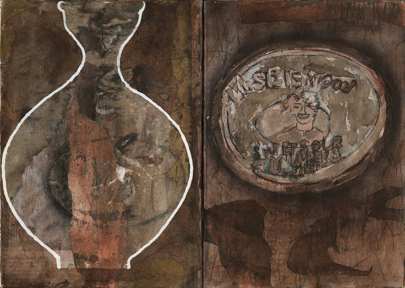 Graphite, ink, colour pencil, acrylic, saw dust, coffee and collage on paper